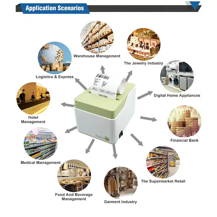 Tốc độ in của nó là 250 mm/s, với chiều rộng in hiệu quả là 72 mm hoặc 64 mm. Nó hỗ trợ nhiều mã vạch, bao gồm UPC-A, EAN-13, CODE39 và CODE128, giúp nó phù hợp với nhiều ngành khác nhau như phục vụ ăn uống, cửa hàng bách hóa và siêu thị.
