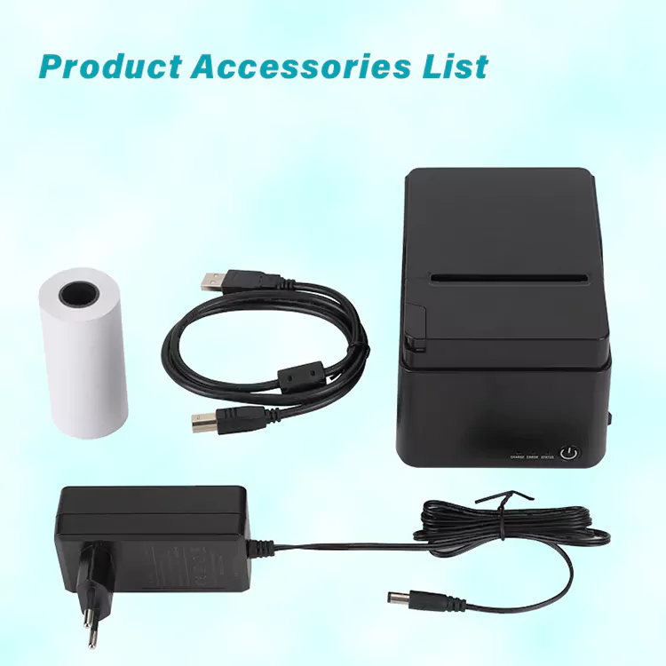 1. Bộ sản phẩm bao gồm: Máy in hóa đơn 80mm, cuộn giấy, cáp USB, sách hướng dẫn, bộ chuyển đổi.